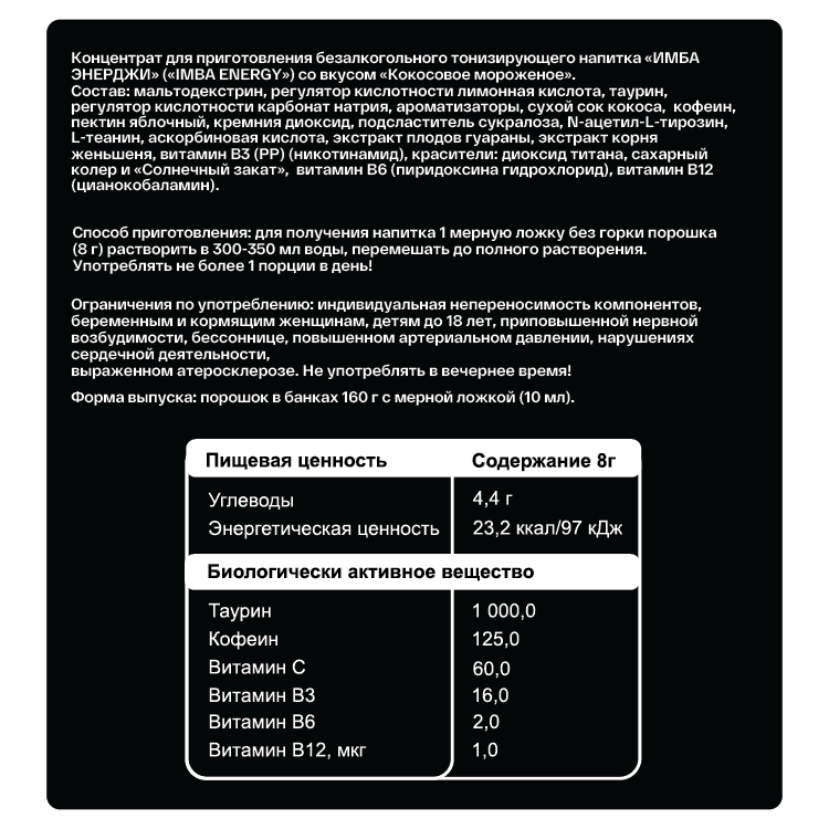Энергетик ИМБА Кокосовое мороженое 20 порций