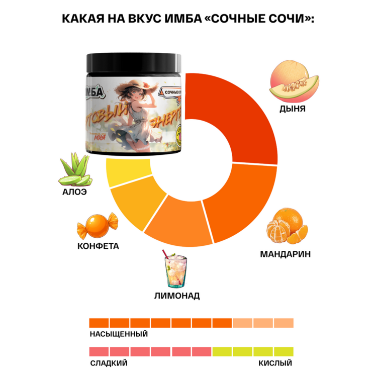 Окунись в атмосферу пляжного курорта с нашей новинкой "Сочные Сочи". Вкус идеально сочетает в себе ароматный апельсин, сочную дыню и кисло-сладкое яблоко, которые подарят тебе приятный летний вайб, а также мощнейший прилив сил и энергии