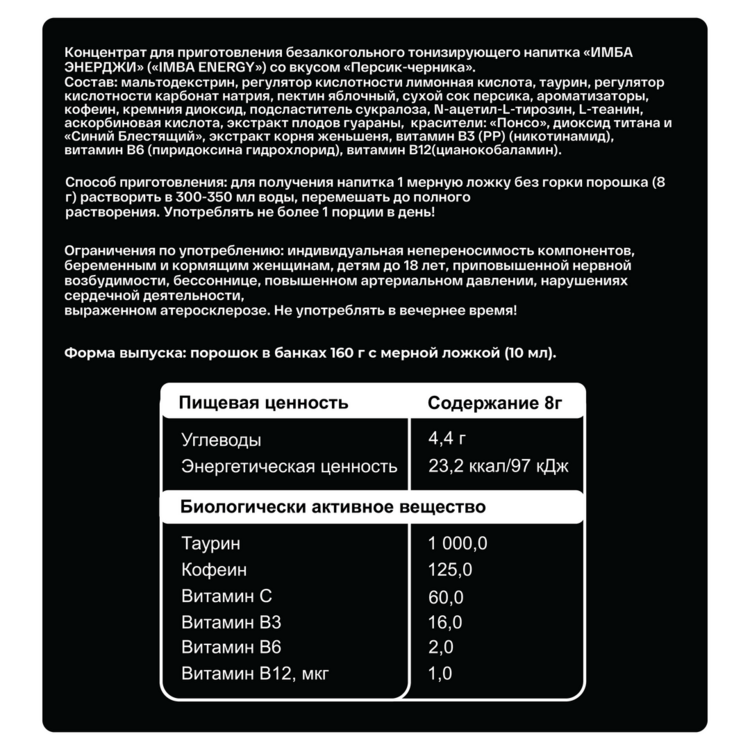 Ингредиенты: мальтодекстрин, регулятор кислотности лимонная кислота, таурин, регулятор кислотности карбонат натрия, сухой сок персика, ароматизаторы, кофеин, пектин яблочный, кремния диоксид, подсластитель сукралоза, N-ацетил-L-тирозин, L-теанин, аскорбиновая кислота, экстракт плодов гуараны, красители: “Понсо”, диоксид титана и “Синий блестящий”, экстракт корня женьшеня, витамин B3 (РР) (никотинамид), витамин В6 (пиридоксина гидрохлорид), витамин В12(цианокобаламин).
