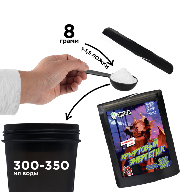 Ингредиенты (Маракуйя Бум): мальтодекстрин, регулятор кислотности лимонная кислота, таурин, регулятор кислотности карбонат натрия, ароматизаторы, кофеин, пектин яблочный, кремния диоксид, подсластитель сукралоза, сухой сок маракуйи, экстракт плодов грейпфрута, N-ацетил-L-тирозин, L-теанин, аскорбиновая кислота, экстракт семян грейпфрута, экстракт плодов гуараны, экстракт корня женьшеня, красители: “Тартразин”, диоксид титана и “Зеленое яблоко”, витамин B3 (РР) (никотинамид), витамин В6 (пиридоксина гидрохлорид), витамин В12 (цианокобаламин).