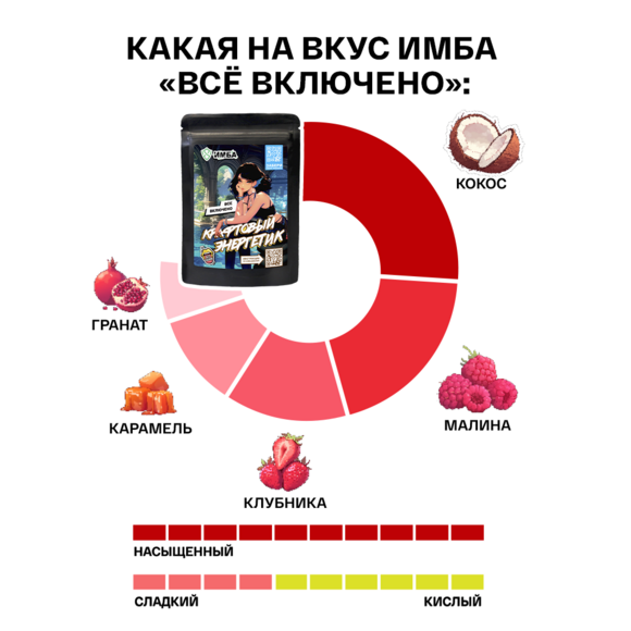 30.01.26Антон УфаСтранный вкус, не могу сказать что он плох, но уж точно не супер, получил в подарок к заказу, сам бы не заказал из-за кокоса, не люблю кокос. На удивление в этом вкусе кокос особо и не ощущается, больше чувствуется малинка, кислинку которой перебивает слабый привкус клубники, гранат очень слабо ощущается (если бы не написали что он тут есть, я бы д…ЕщёПолезный отзыв?Да 5Нет 0Ответ команды ИМБА