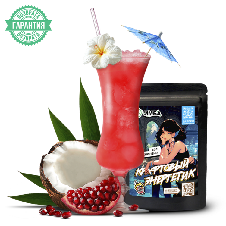 Ингредиенты (Всё включено): мальтодекстрин, регулятор кислотности лимонная кислота, таурин, регулятор кислотности карбонат натрия, ароматизаторы, сухой сок граната, кофеин, подсластитель сукралоза, пектин яблочный, кремния диоксид, N-ацетил-L-тирозин, L-теанин, аскорбиновая кислота, сухой сок кокоса, экстракт плодов гуараны, экстракт корня женьшеня, красители: “Понсо” и диоксид титана, витамин B3 (РР) (никотинамид), витамин В6 (пиридоксина гидрохлорид), витамин В12 (цианокобаламин).